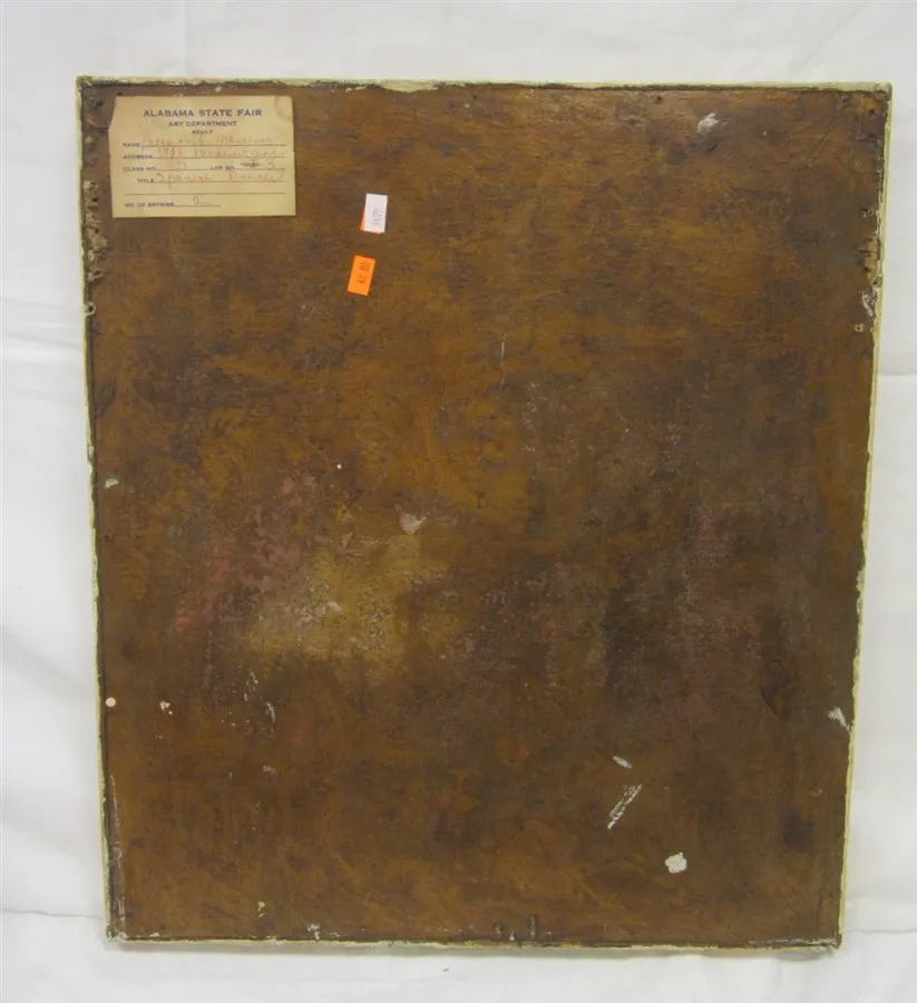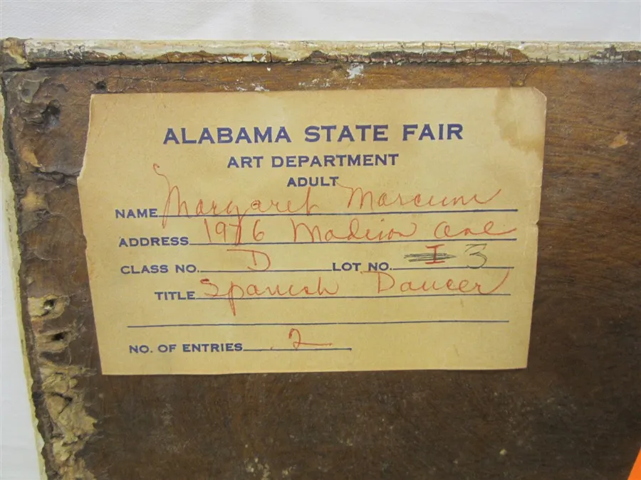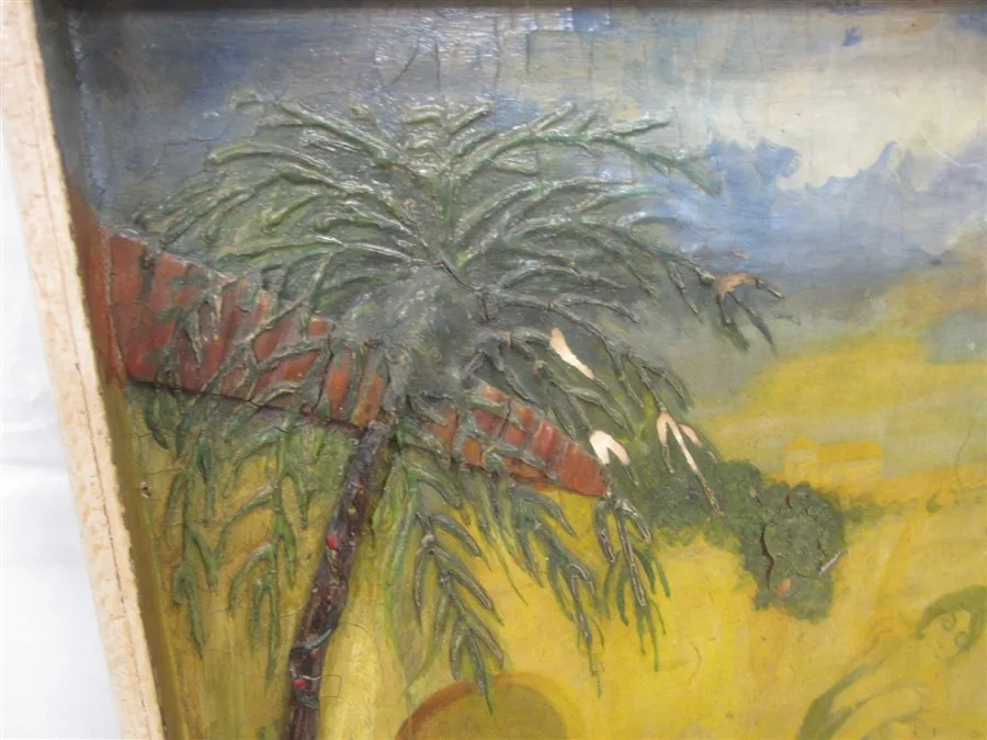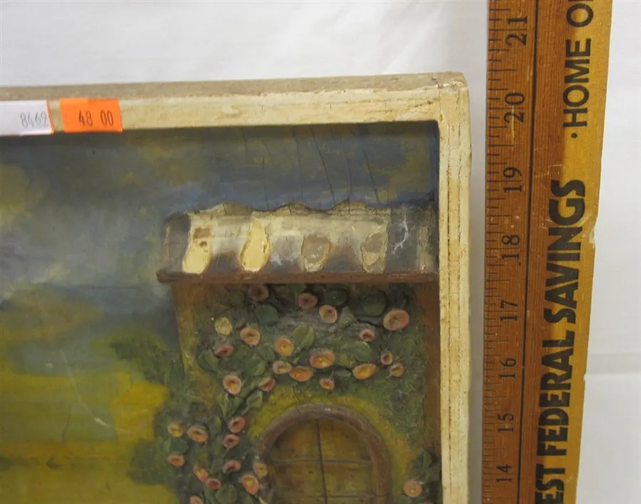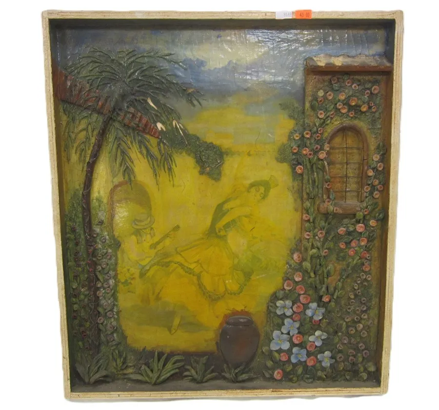A RELIEF SCENE OF A SPANISH DANCER: A PRINT WITH PAINTED PLASTER OVERLAY CREATING A 3D IMAGE OF A DANCER BETWEEN A TREE AND A HOUSE. AS IS, SOME PLASTER MISSING FROM THE FRAME AND SCENE. MISSING THE TIMBERS FROM THE ROOF