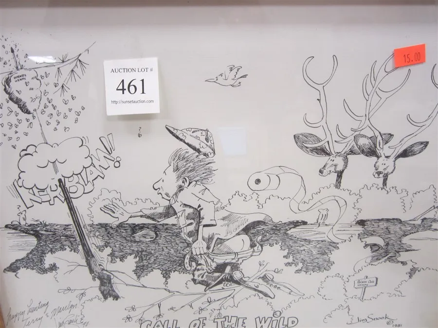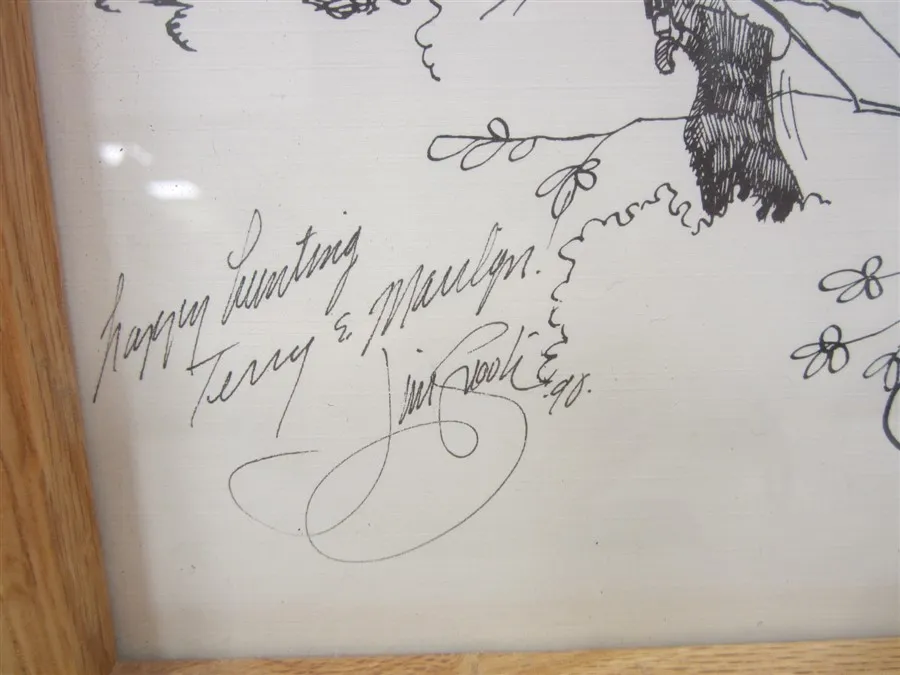 JIM SNOOK 1981 PRINT IN RED OAK FRAME. TITLED CALL OF THE WILD