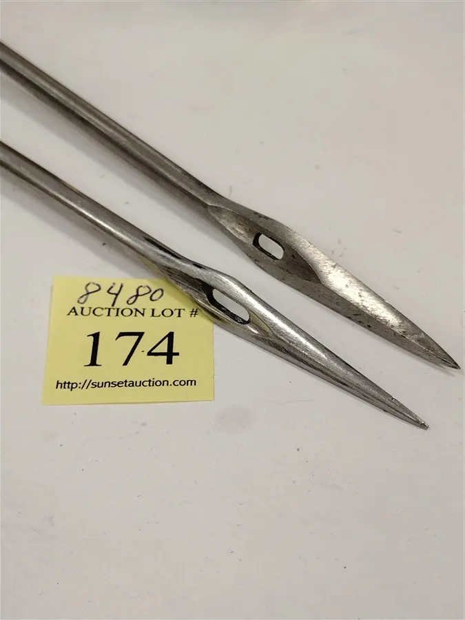 OLD CARDBOARD FRUIT BOX, TWO SAIL OR SADDLE MAKER'S NEEDLES, TIN AND MORE