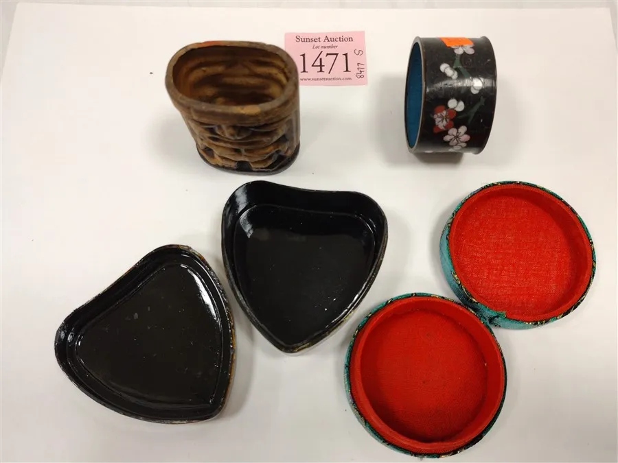 TWO TRINKET BOXES, CLOISONNE METAL NAPKIN RING, TIKI TOOTHPICK HOLDER