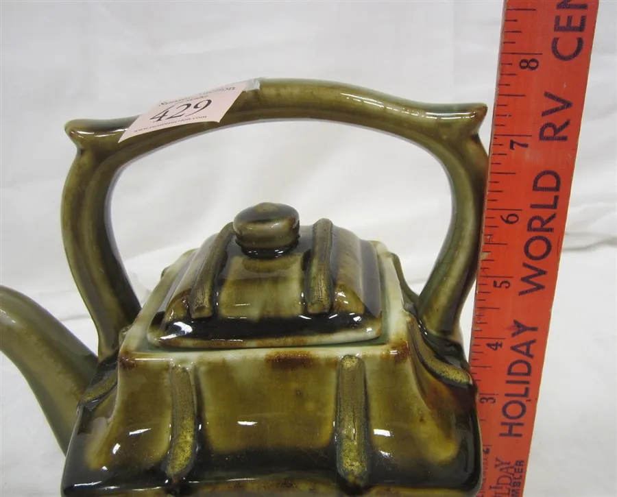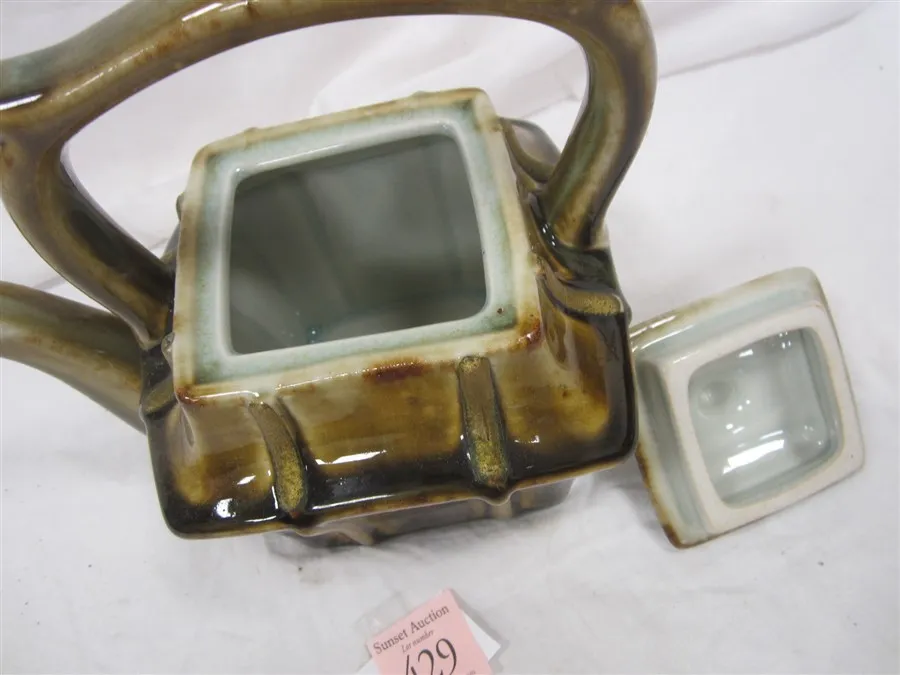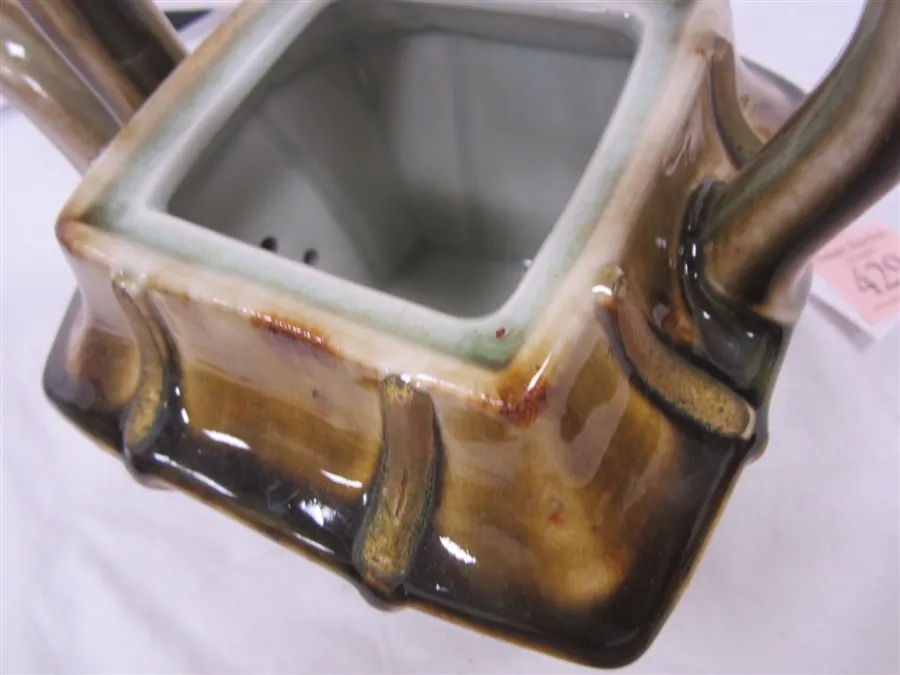 GLOSSY GLAZE REMINISCENT OF MAJOLICA, VERTICAL LINES ARE PAINTED GOLD OVER THE GLAZE AS AN ACCENT. GLAZE FLAW ON THE RIM UNDER THE LID.