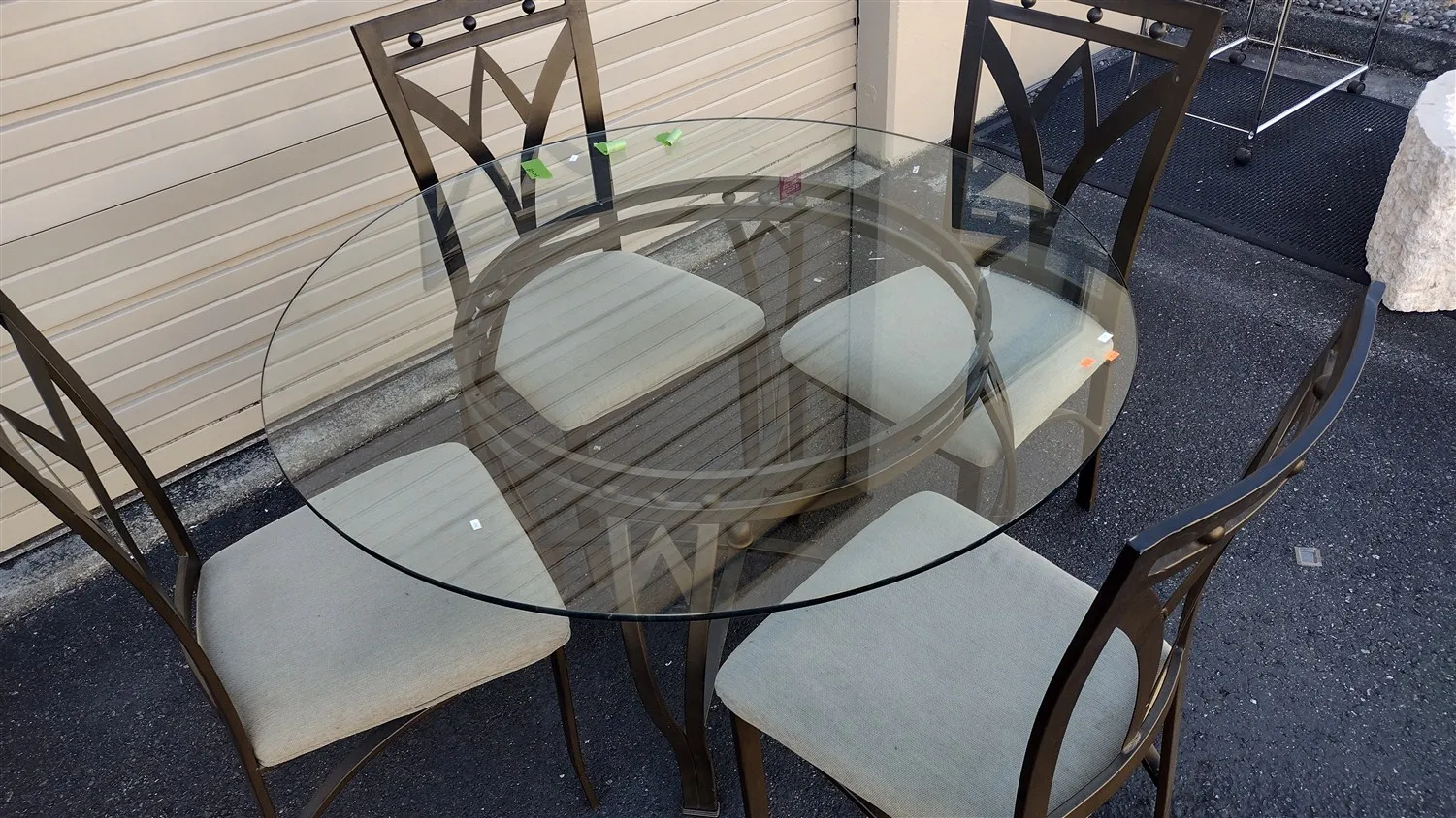 CONTEMPORARY ROUND GLASS AND METAL DINING TABLE AND FOUR CHAIR