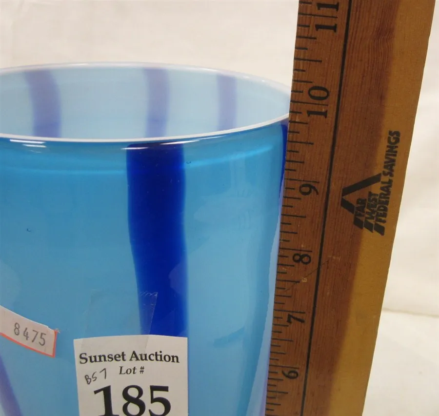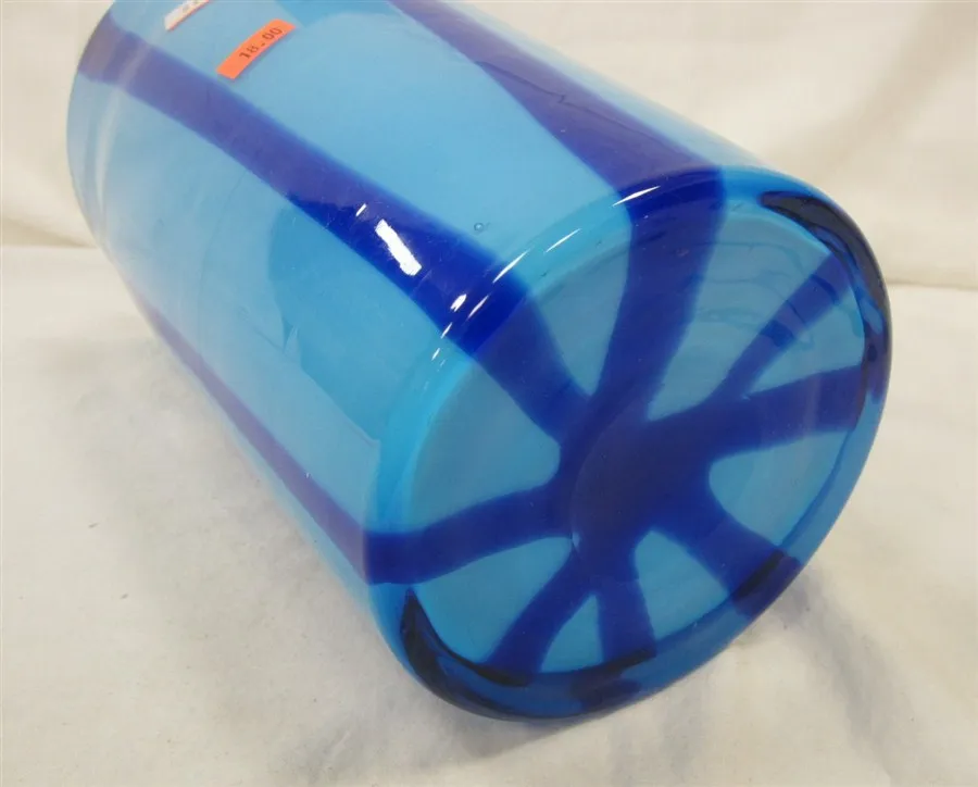 CONTEMPORARY STRIPED CASED ART GLASS VASE - TURQUOISE AND BLUE WITH CASED WHITE INTERIOR