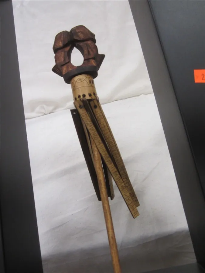 DECORATIVE BATAK BAMBOO CALENDAR WITH TWO FIGURES ON DECORATIVE STAND