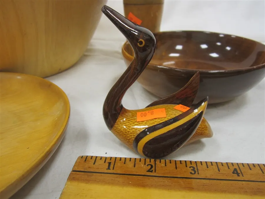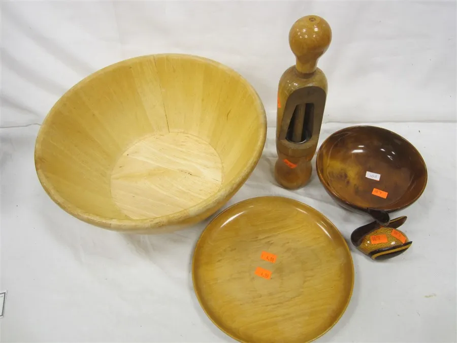 WOOD LOT: SALAD BOWL, WINE CORKER, SMALL BOWL, TRAY AND WOODEN BIRD