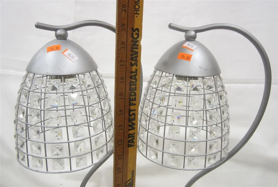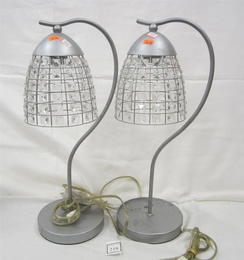 PAIR OF CONTEMPORARY TABLE LAMPS WITH CRYSTAL STYLE SHADES.  ONE LAMP HAS DENT AND STAIN ON BASE