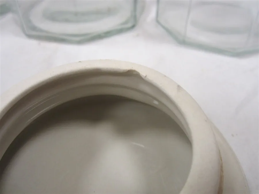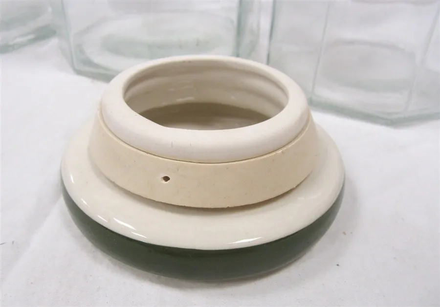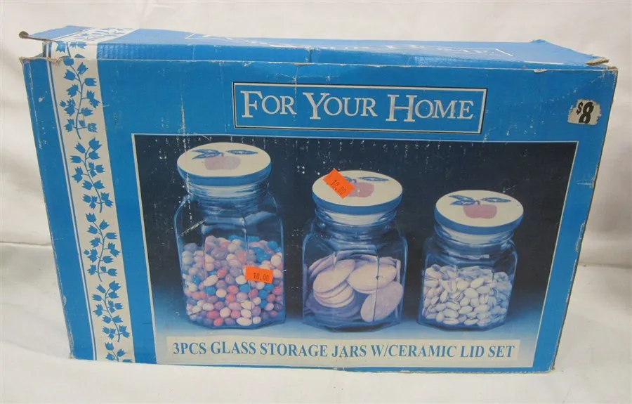 SET OF THREE GRADUATED GLASS JARS WITH CERAMIC LIDS. HAS BOX, WILL NEED CLEANING.