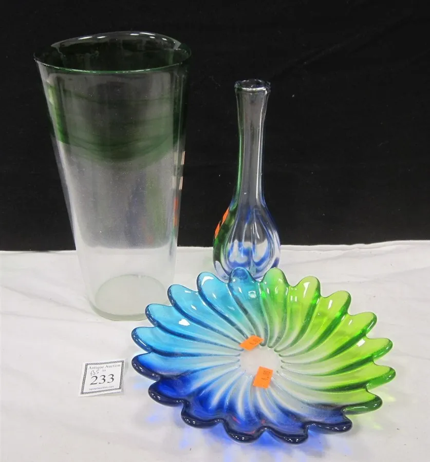 THREE BLUE AND GREEN ART GLASS PIECES: TWO VASES AND LOW BOWL