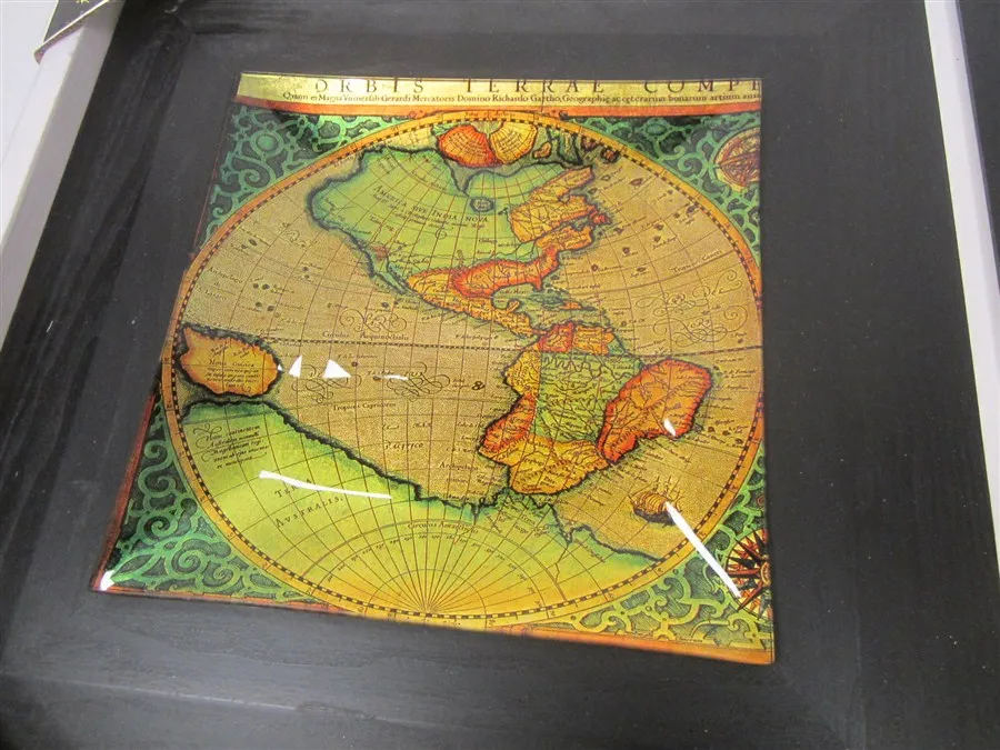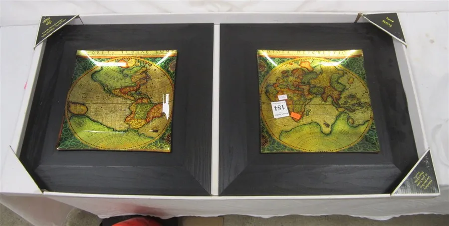 TWO NEW IN PACKAGE FRAMED ART GLASS PLATES OF ANTIQUE WORLD MAPS