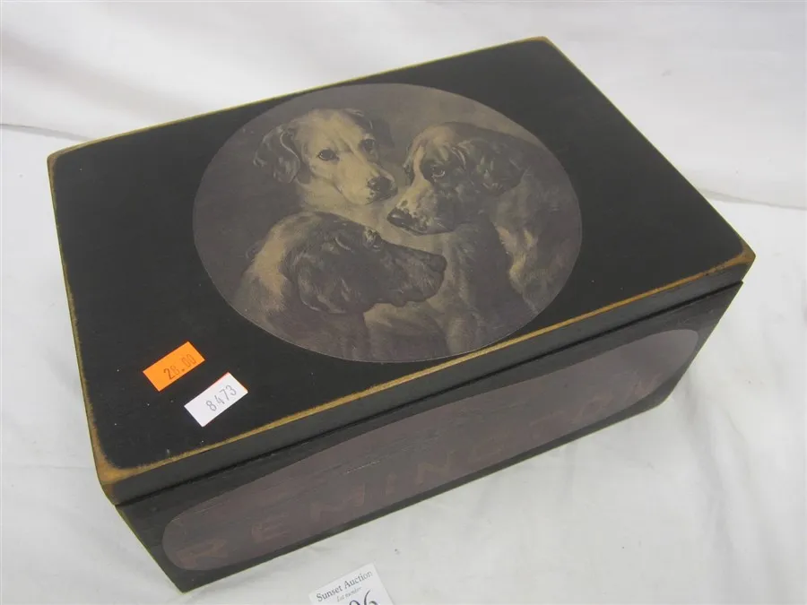 WOOD BOX WITH REMINGTON LOGO AND THREE DOGS ON LID