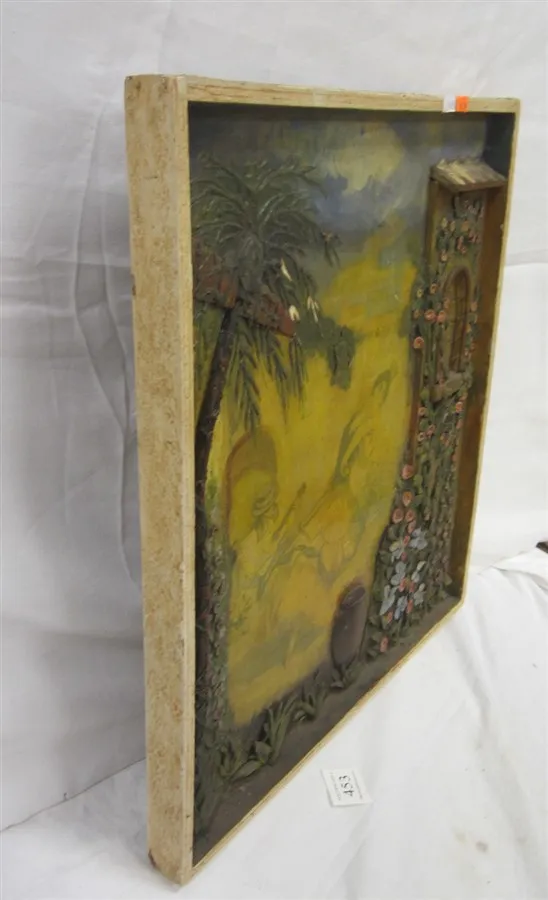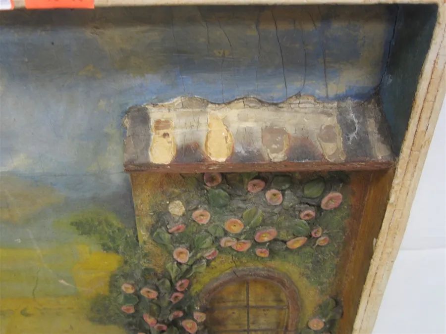 A RELIEF SCENE OF A SPANISH DANCER: A PRINT WITH PAINTED PLASTER OVERLAY CREATING A 3D IMAGE OF A DANCER BETWEEN A TREE AND A HOUSE. AS IS, SOME PLASTER MISSING FROM THE FRAME AND SCENE. MISSING THE TIMBERS FROM THE ROOF