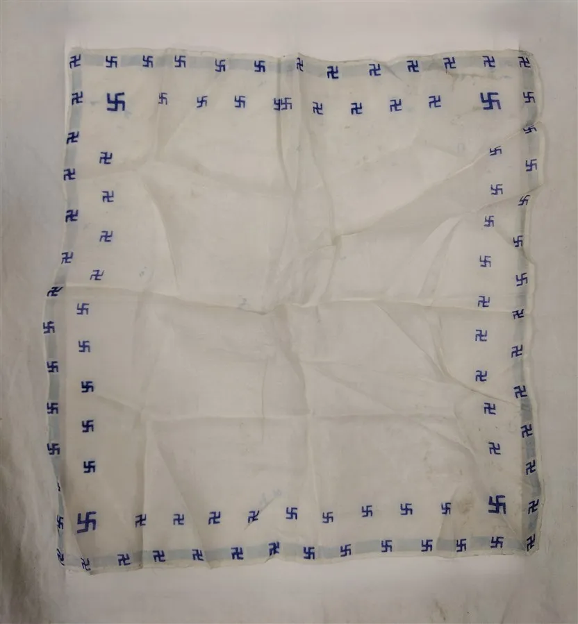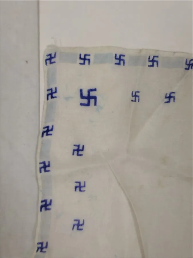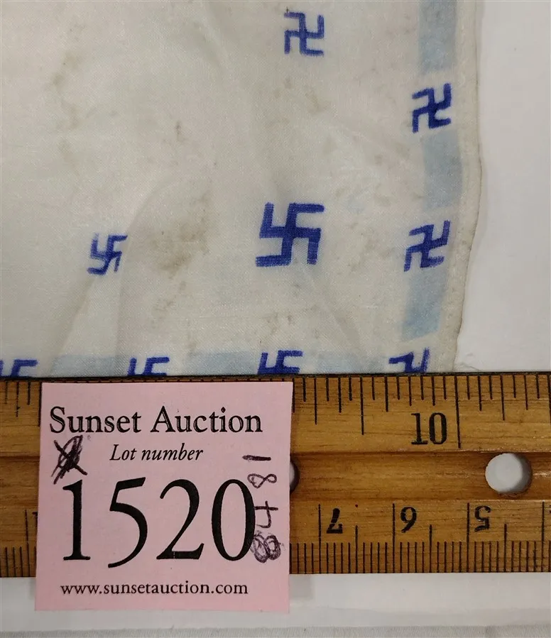 OLD THIN HANKY PRINTED WITH SWASTIKA PATTERN.  LIKELY TOO OLD TO BE GERMAN.  MACHINED EDGE.  SOME WEAR SPOTS WORN THIN.