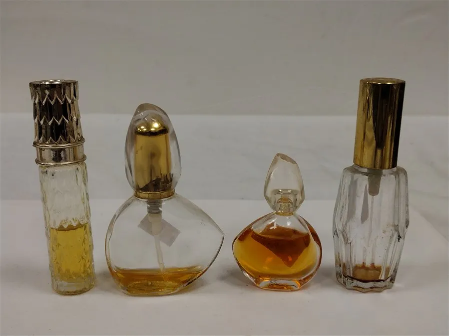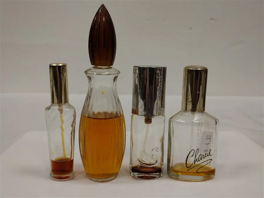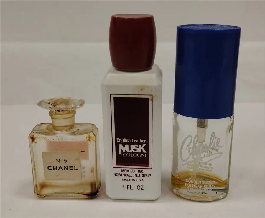 10 VINTAGE PERFUME BOTTLES, SOME WITH CONTENTS. ENGLISH LEATHER MUSK