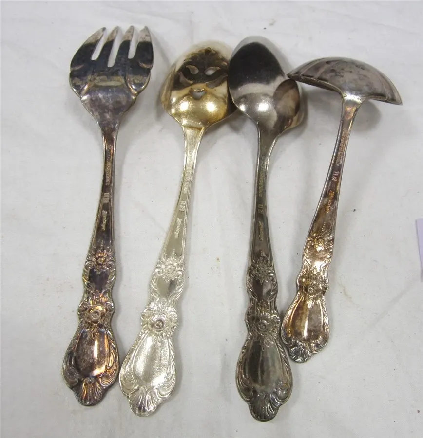 ROGERS BROTHERS HERITAGE SILVER PLATE FLATWARE SERVING SET: MEAT FORK, SOUP SERVING LADLE, SLOTTED SPOON, AND SERVING SPOON