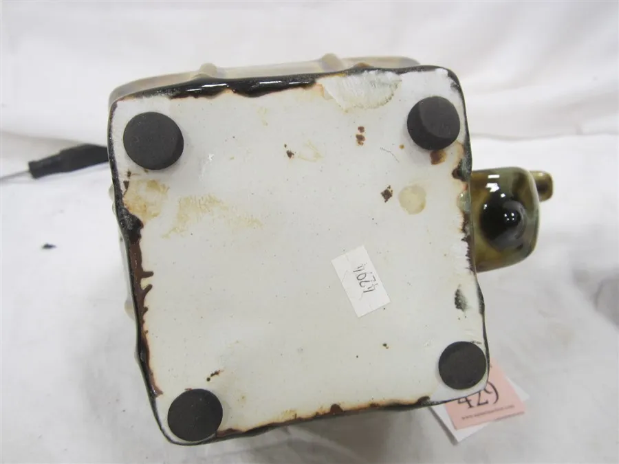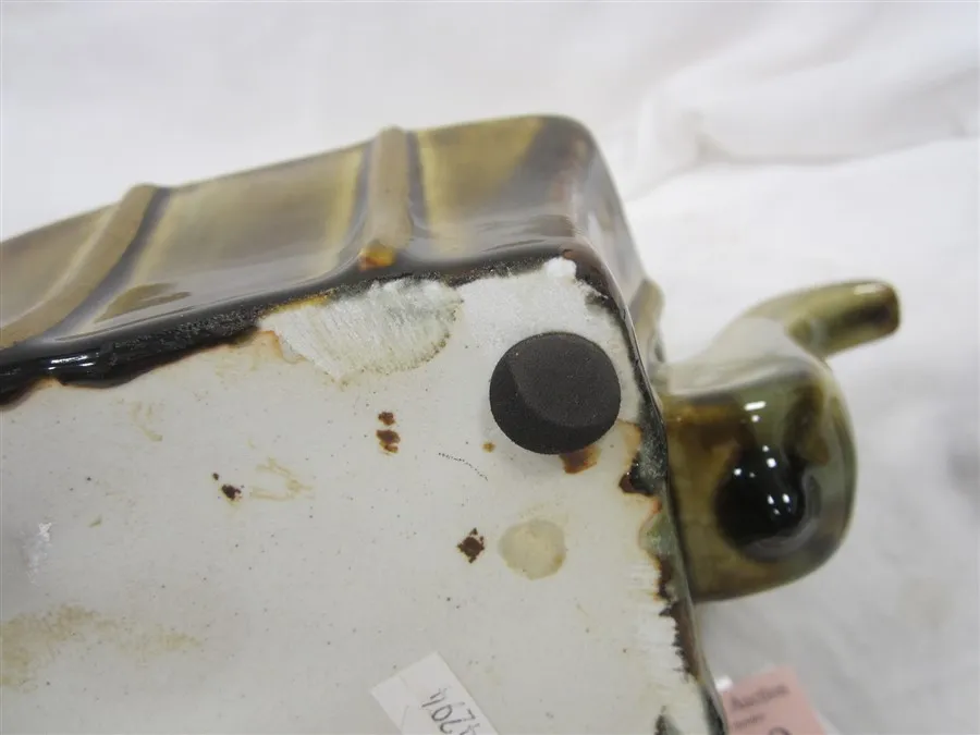 GLOSSY GLAZE REMINISCENT OF MAJOLICA, VERTICAL LINES ARE PAINTED GOLD OVER THE GLAZE AS AN ACCENT. GLAZE FLAW ON THE RIM UNDER THE LID.