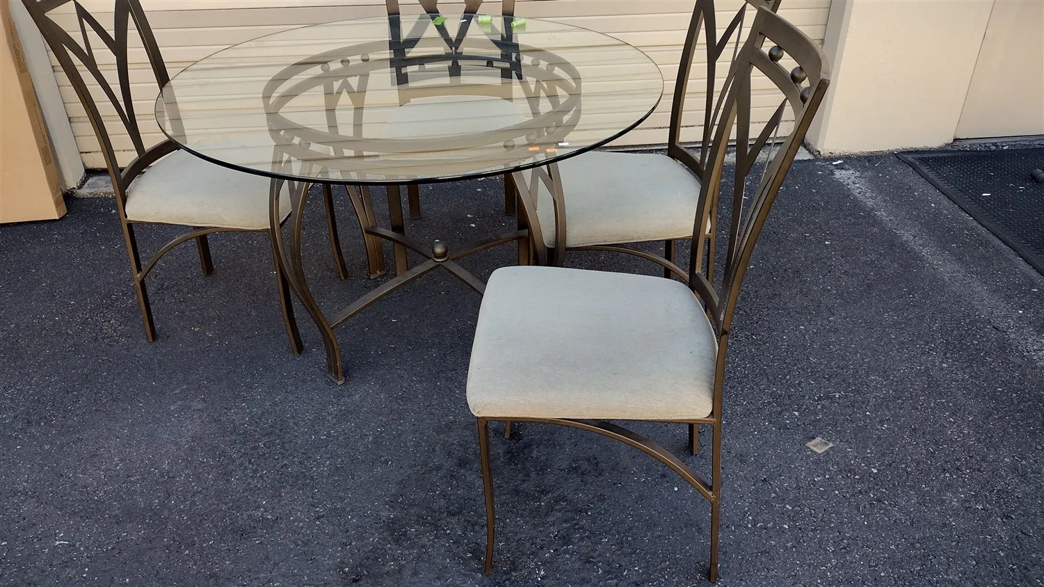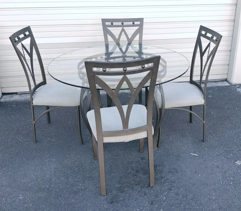 CONTEMPORARY ROUND GLASS AND METAL DINING TABLE AND FOUR CHAIR