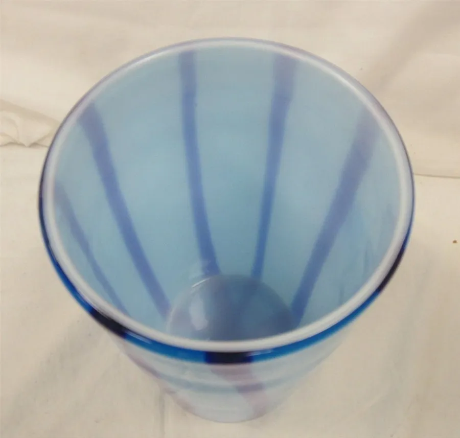 CONTEMPORARY STRIPED CASED ART GLASS VASE - TURQUOISE AND BLUE WITH CASED WHITE INTERIOR