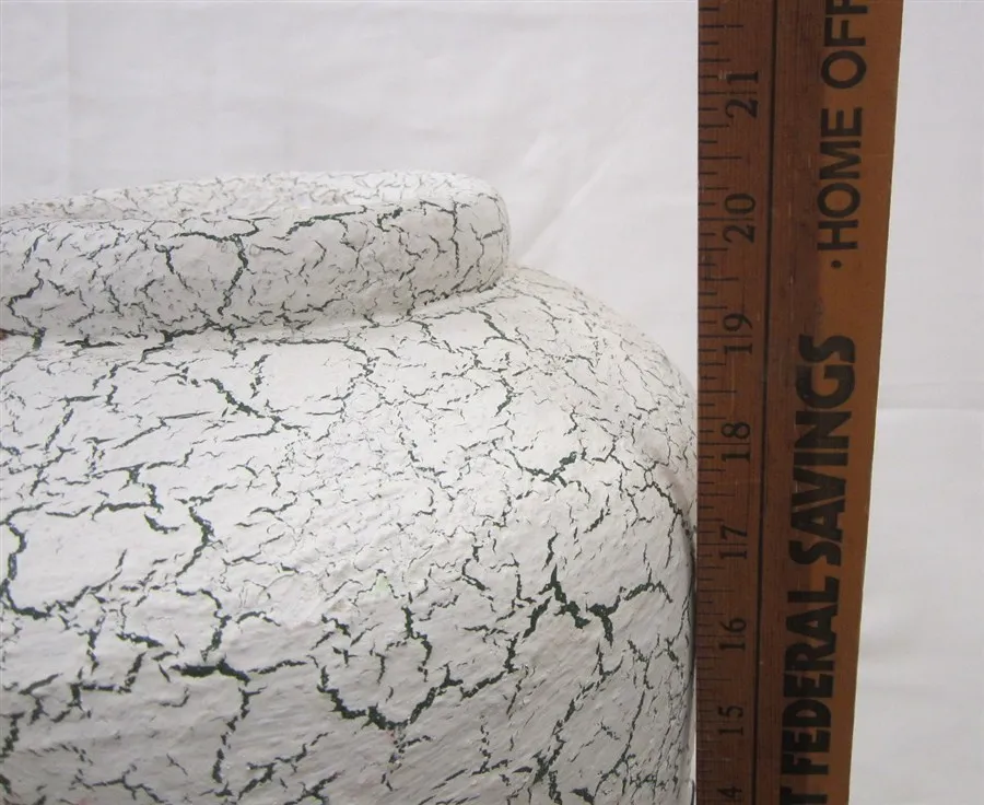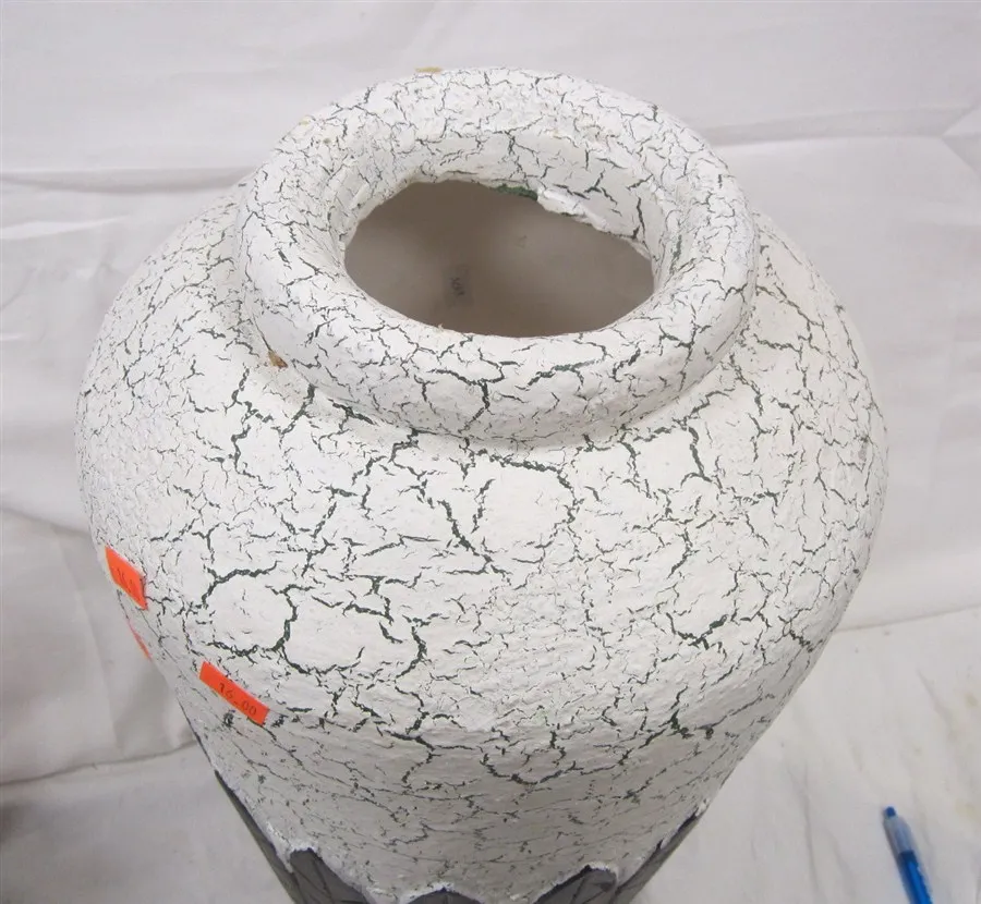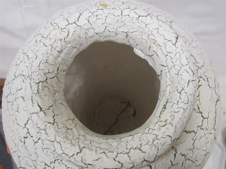LARGE TEXTURED PLASTER FLOOR VASE, BLACK & WHITE.  HOLE IN BOTTOM.  SOME PAINT CHIPS
