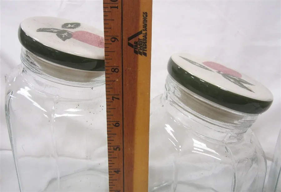SET OF THREE GRADUATED GLASS JARS WITH CERAMIC LIDS. HAS BOX, WILL NEED CLEANING.