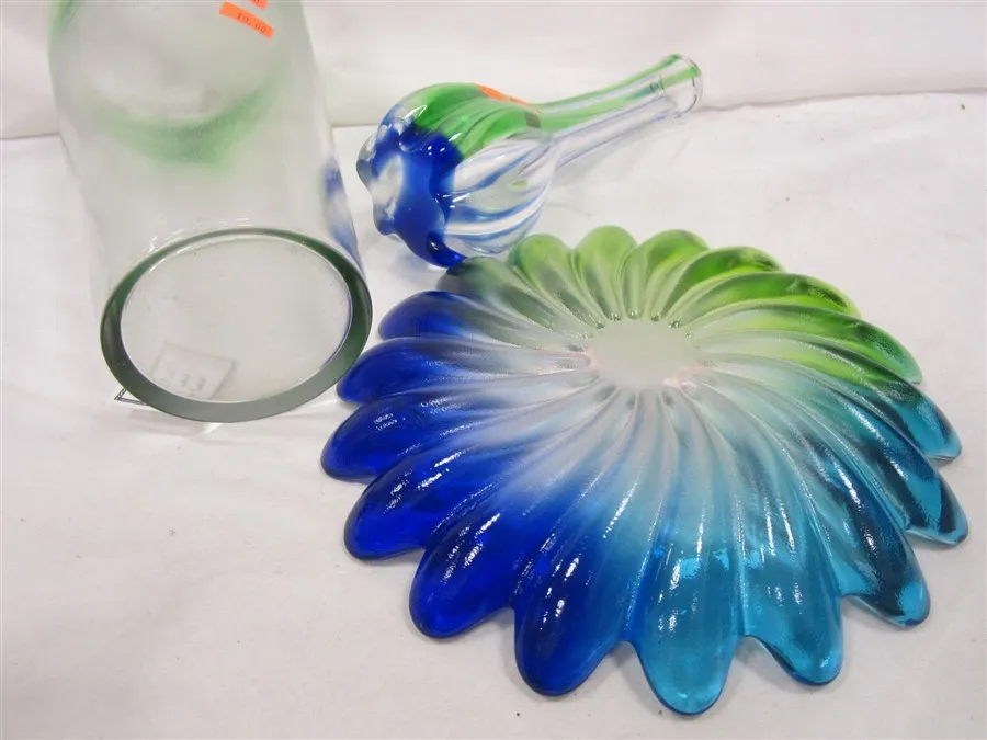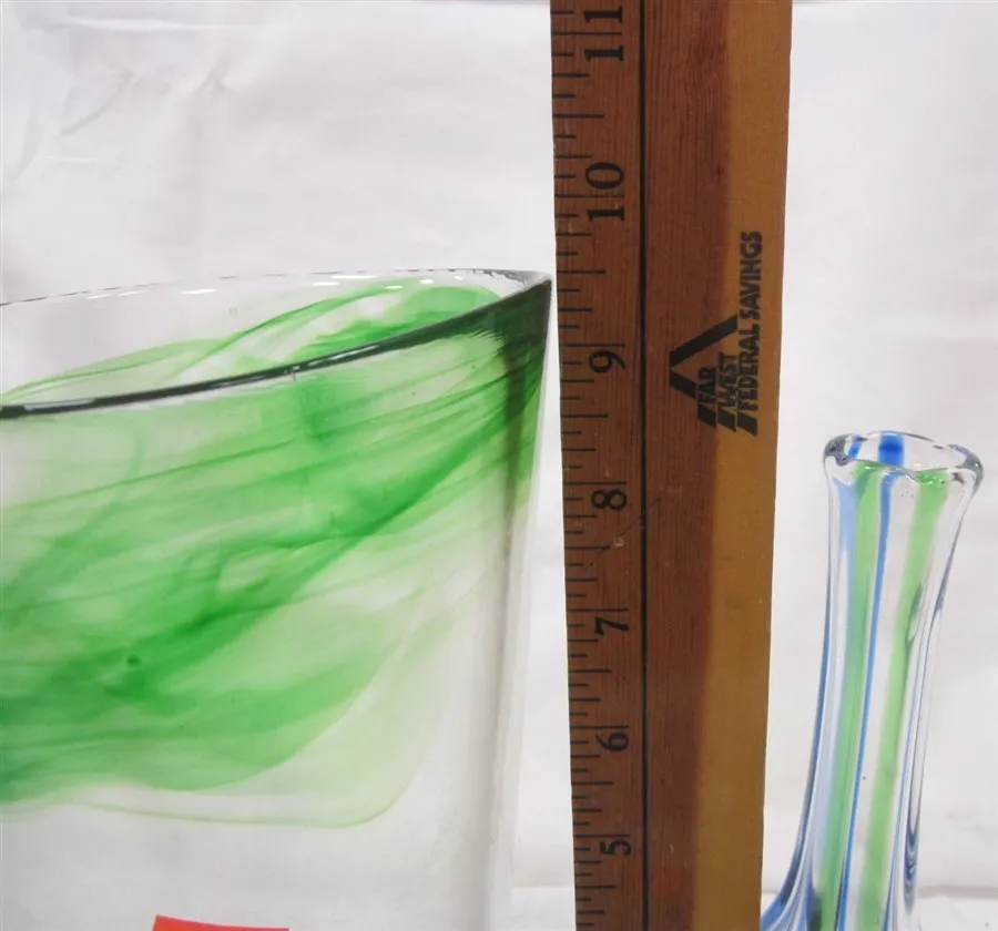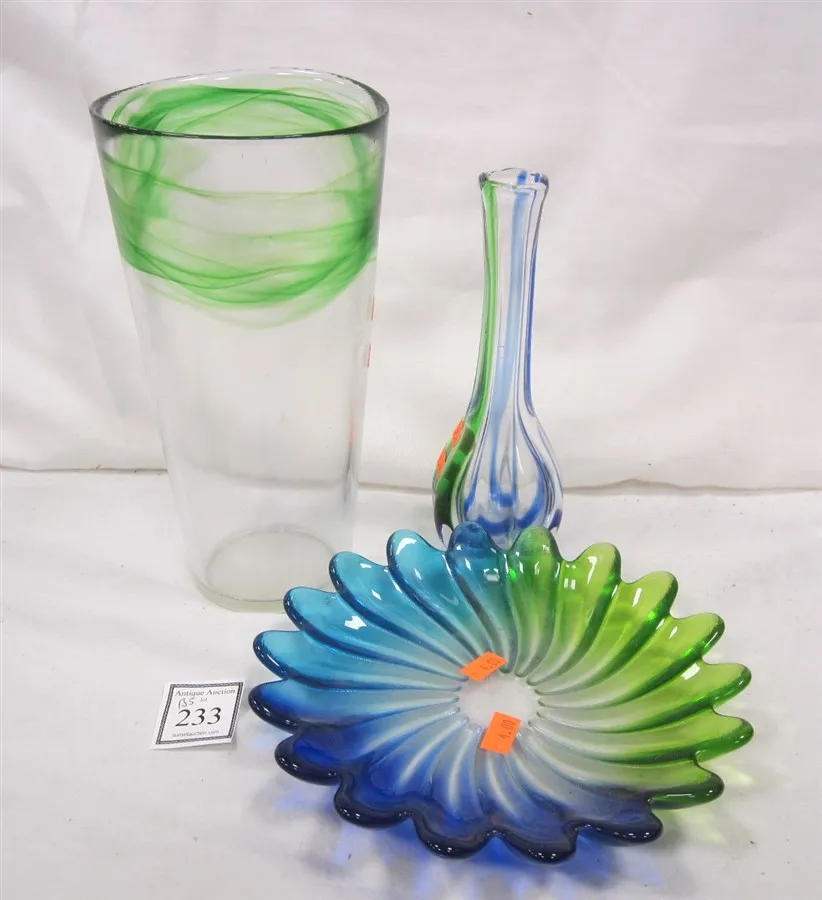 THREE BLUE AND GREEN ART GLASS PIECES: TWO VASES AND LOW BOWL