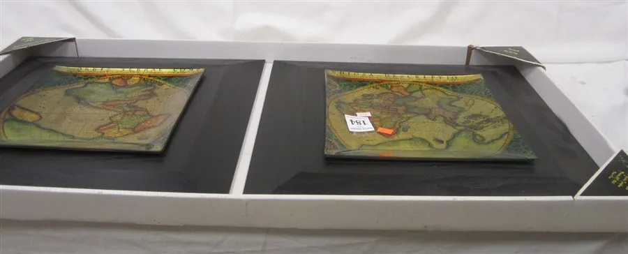 TWO NEW IN PACKAGE FRAMED ART GLASS PLATES OF 18TH CENTURY WORLD MAPS
