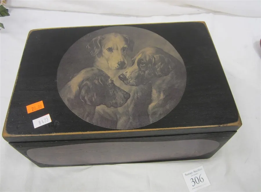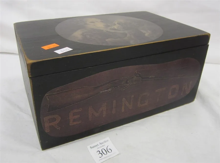 WOOD BOX WITH REMINGTON LOGO AND THREE DOGS ON LID